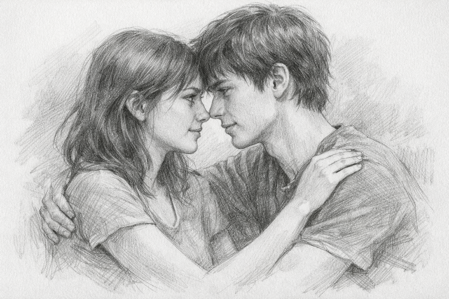 Bleistiftzeichnung eines jungen Paares, etwa 16 bis 18 Jahre alt, das sich eng umarmt und sich ruhig in die Augen schaut – ein Moment von Nähe, Vertrauen und Zurückhaltung.